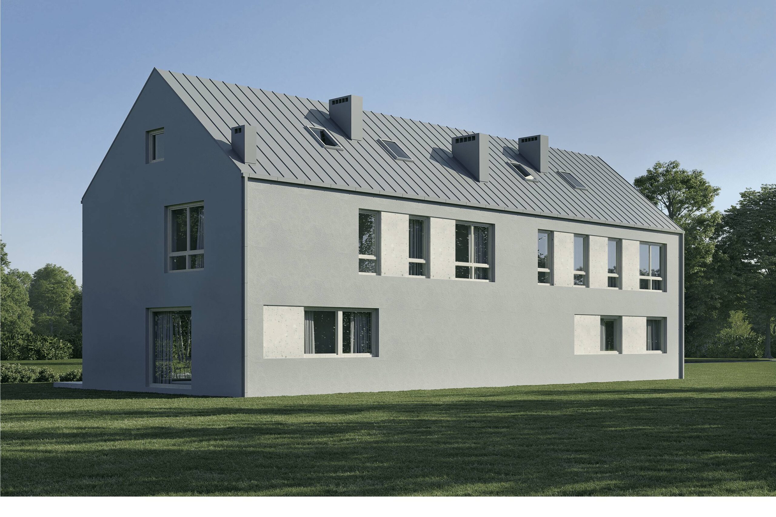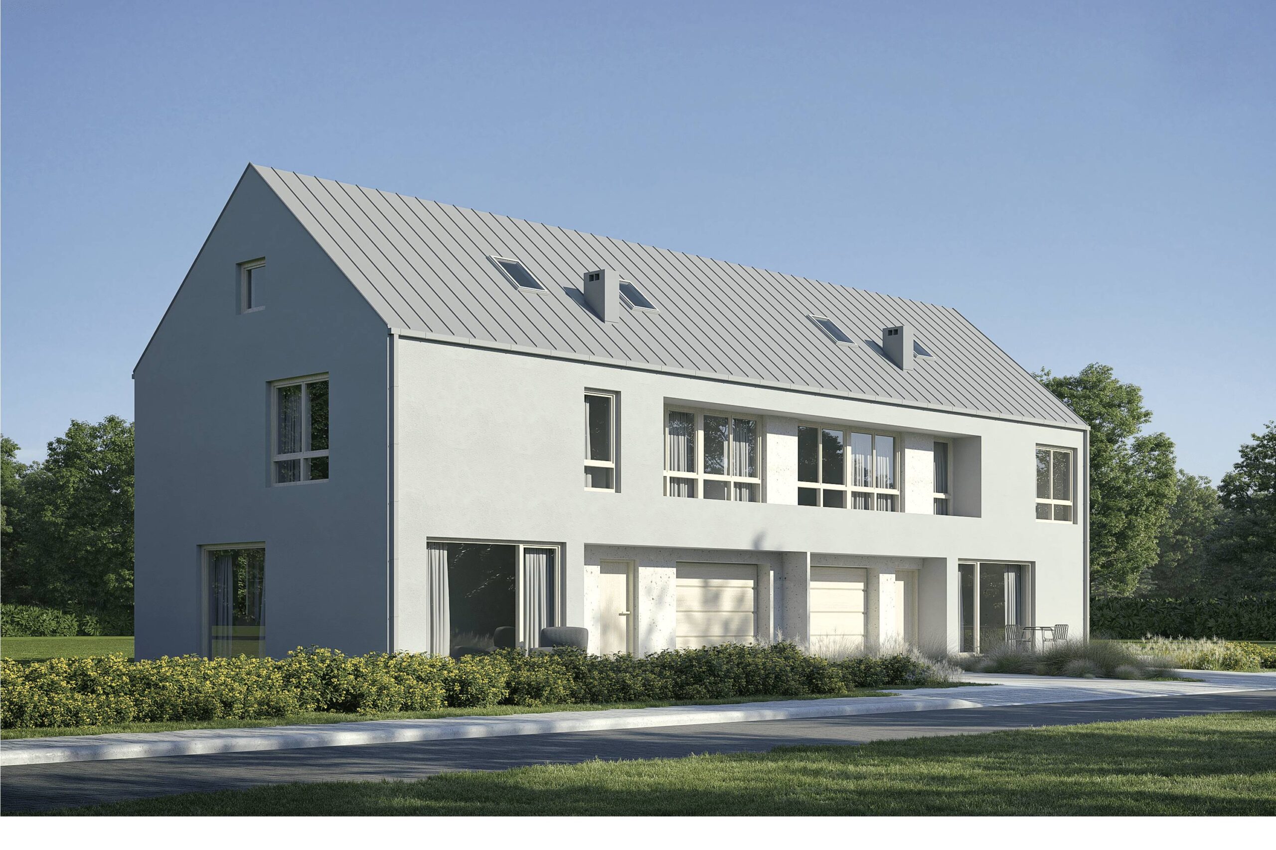 Nowoczesny, asymetryczny dom dwulokalowy z dużymi przeszkleniami w Michałowie-Grabinie